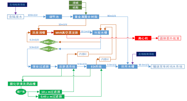 太陽能廢水處理按照產品不同可分為多晶硅廢水處理、單晶硅廢水處理、薄膜廢水處理。其中多晶硅廢水主要污染物為氫氟酸及少量有機物,單晶硅為氫氟酸和COD,薄膜電池板是重金屬、有機物等污染物。我公司根據不同的產品選擇不同的處理工藝。以下為一套典型的薄膜太陽能廢水處理工藝: