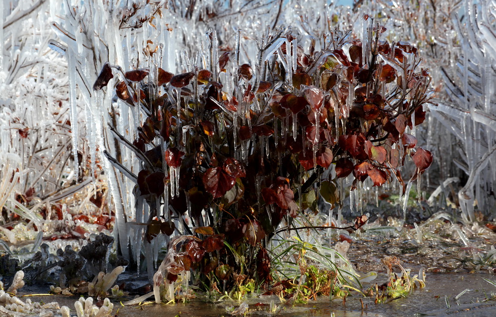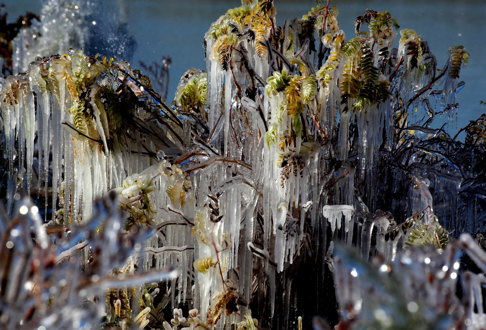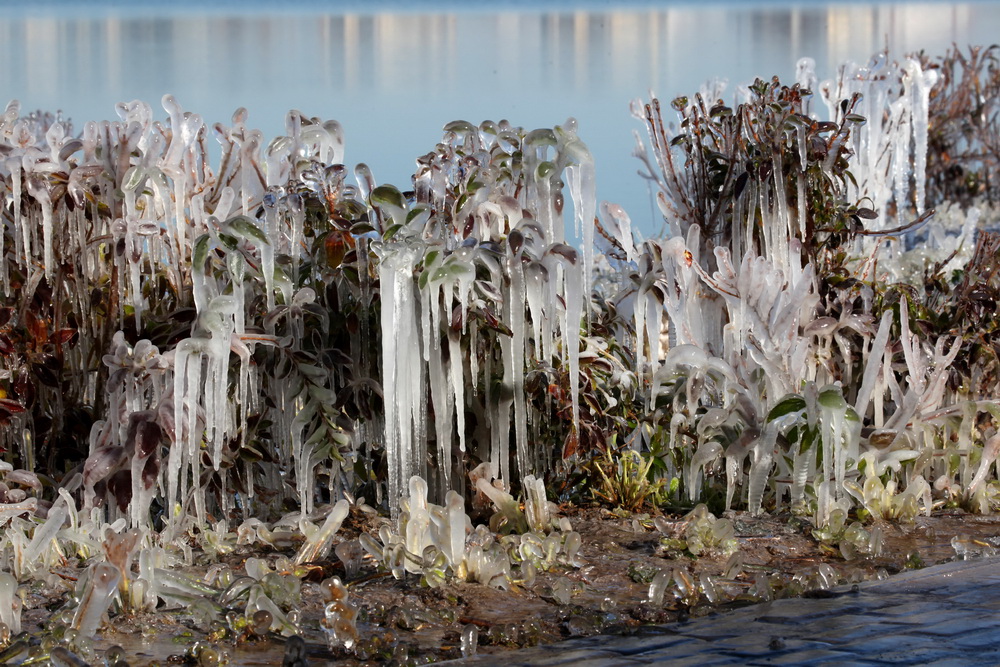 2015年10月31日,甘肅省張掖市,濱河新區受前一天強降雪天氣影響氣溫下降,正在灌溉的樹木、植被形成冰掛,玉樹瓊花美麗壯觀。