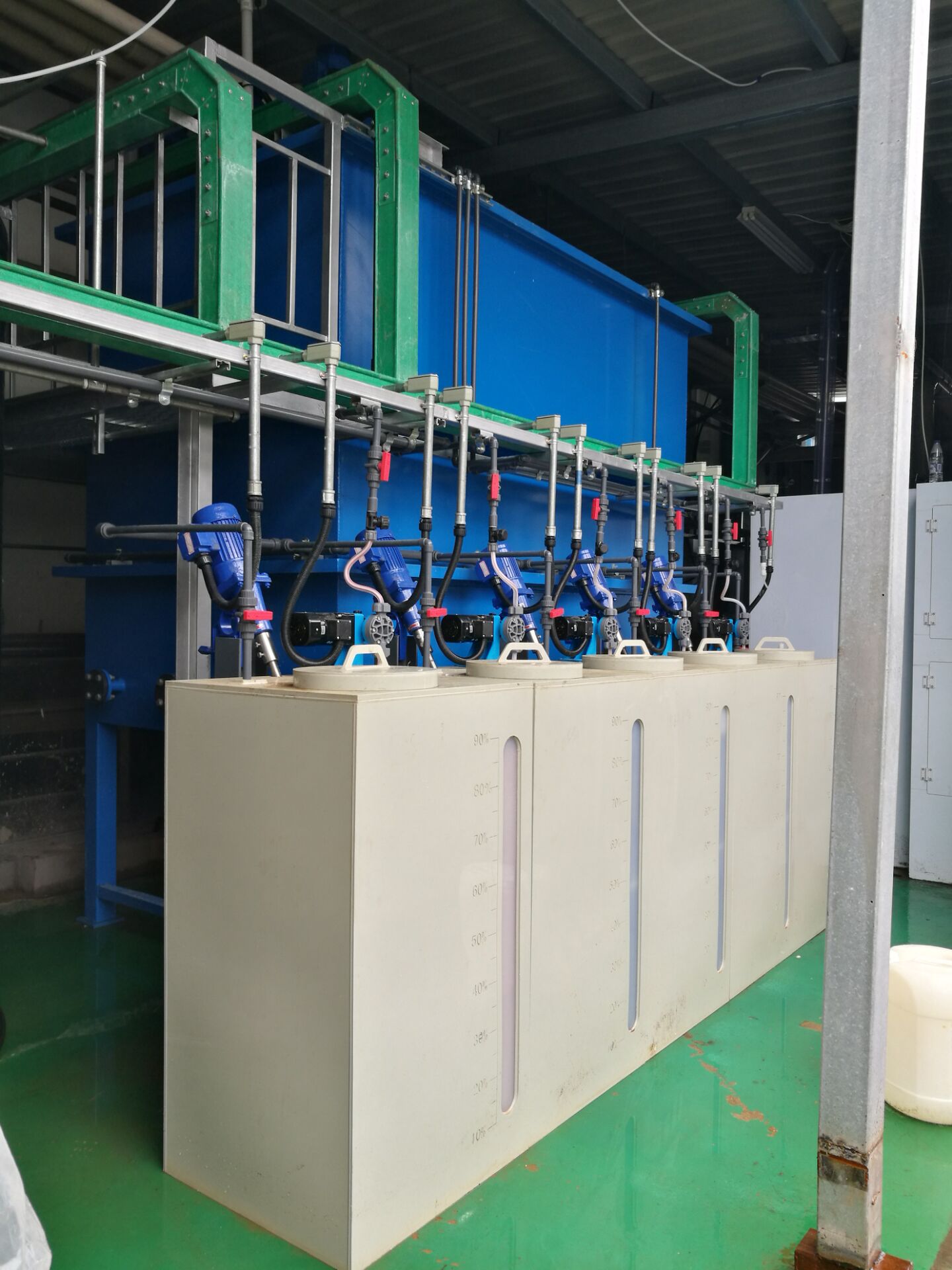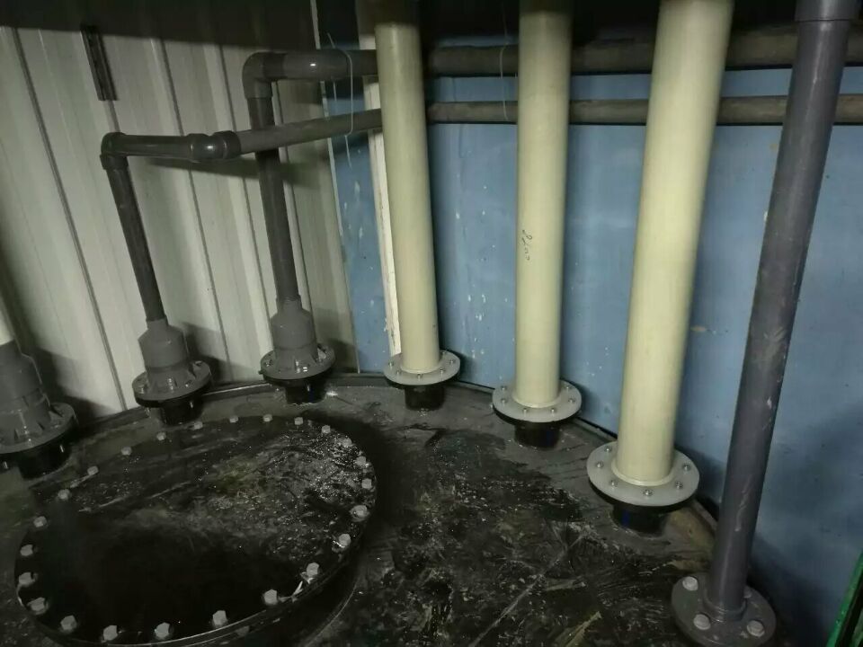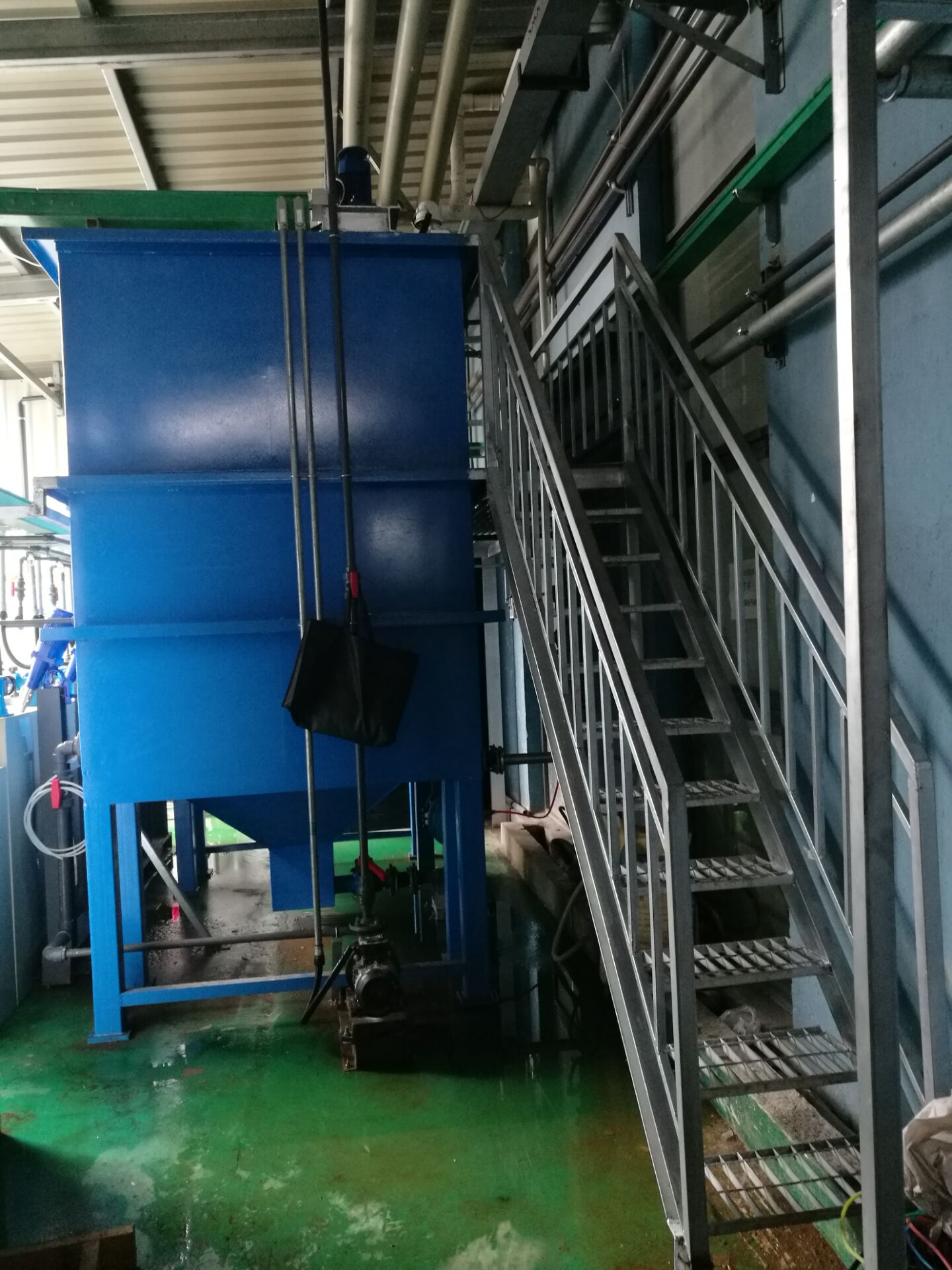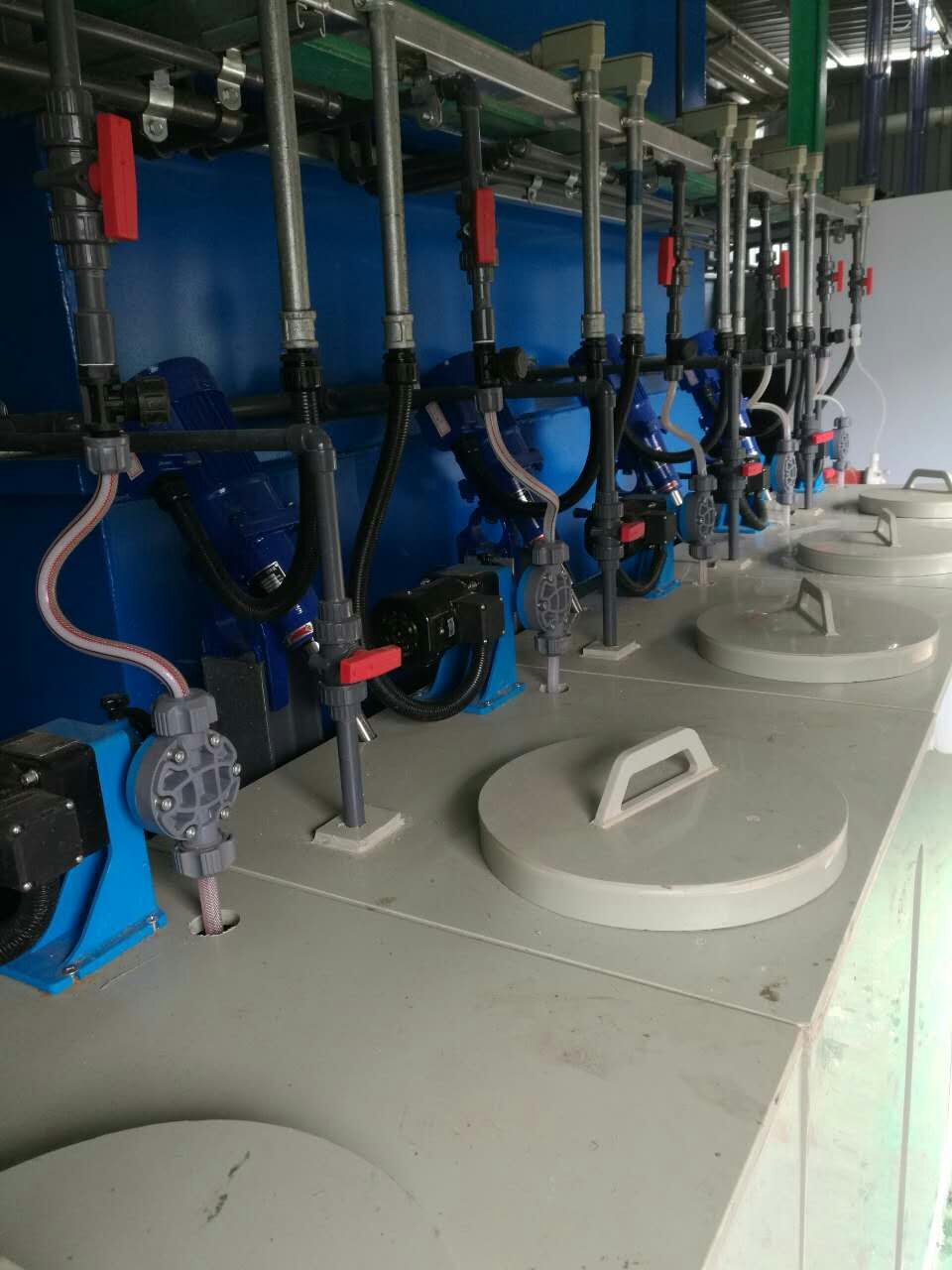 廢酸和產生的廢水產生后一次性排入容積為足夠容量的廢液儲槽,儲槽制作材質為進口HDPE,可長時間耐受氫氟酸的腐蝕。然后經由磁力泵打入一體化反應沉淀槽中進行化學反應,其中PAC,MgC12,H3PO4加入到混合槽中,NaOH經由PH控制器自動控制加入到反應槽中,PAM加入到絮凝槽中,對廢水中的氟離子和氨氮進行化學反應。根據加藥量的大小,可達到去除污染物的目的。